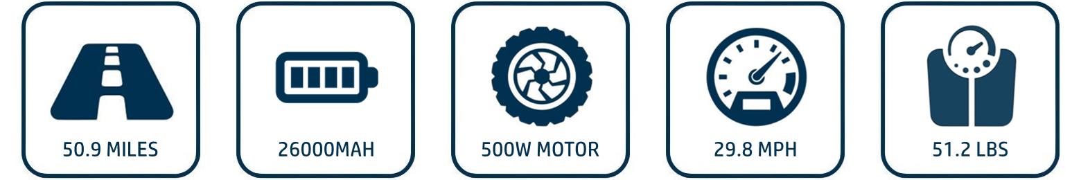 Several 18650 high-capacity lithium batteries deliver up to 50.9 miles of travel on a single charge. Smart battery management via the LCD displays the health of the battery pack and notifies you immediately if there are issues. The battery is safe and durable with a capacity of 26000mAh. Acceleration is fast reaching a maximum speed of 29.8 mph. A full charge can take you 50.9 miles.